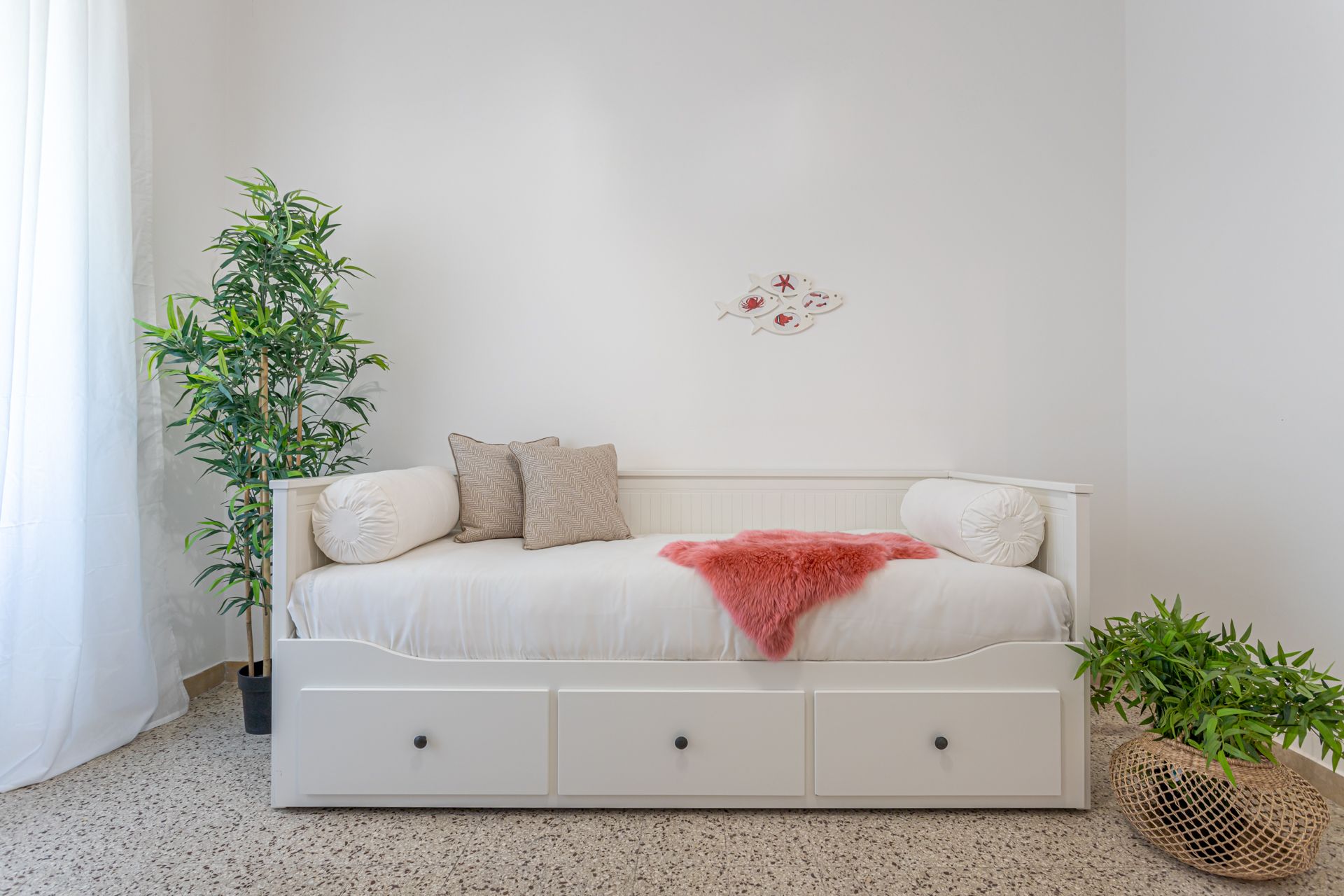 Con pochi arredi preesistenti e una palette ispirata al mare, abbiamo dato vita a un’atmosfera da cartolina. I tessuti naturali aggiungono fluidità, leggerezza e relax—proprio come la brezza marina.